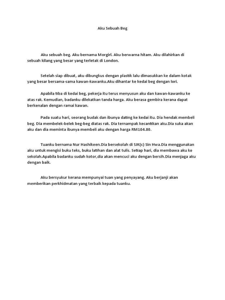 Aku sebuah beg sekolah yang berjenama 有品牌. Karangan Aku Sebuah Buku. Aku sebuah begaku berjenama AdidasAku dibawa ke Malaysia dan aku dipamerkan di sebuah kedai aku berwarna hitam dan belangku berwarna putih aku melihat kawan-kawan ku dibeli oleh ramai orang yang mengunjungi tempat iniaku hanya menunggu untuk dibeli oleh orangAku berharap aku dibeli oleh seseorang yang baik.